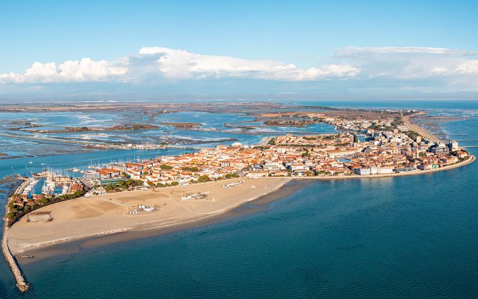 Foto panoramica con drone della penisola di Grado, provincia di Gorizia, regione Friuli Venezia Giulia, Italia.